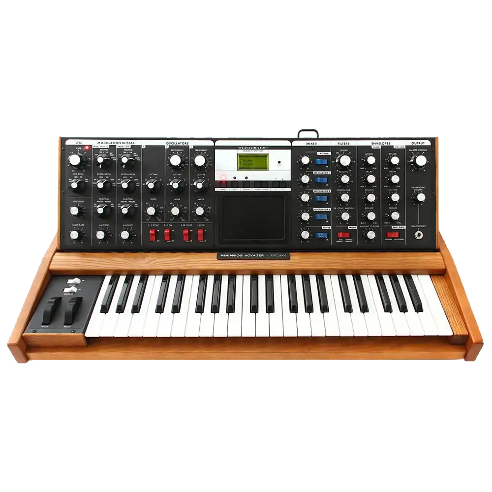The Moog Voyager is a renowned analog synthesizer, known for its rich, warm sounds and extensive modulation capabilities. It features a highly expressive keyboard with aftertouch, making it ideal for both studio production and live performances.